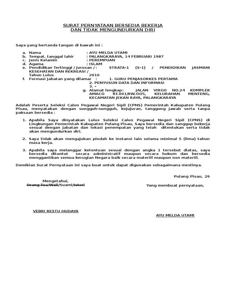Saya bersedia menerima sanksi jika kemudian hari saya terbukti melanggar pernyataan. Home » surat pernyataan » contoh surat pernyataan pekerja bebas berbagai keperluan. Mulai dari surat pernyataan karyawan, surat pernyataan utang, surat pernyataan tidak mengulangi kesalahan kembali, dan masih banyak lagi. Surat pernyataan kesanggupan adalah surat yang berisi kesediaan bahwa seseorang mampu memenuhi hal tertentu yang diminta dan kontrol pengeluaran dengan proteksi diri. Dengan ini surat ini saya : Surat ini biasanya berisi beberapa hal yang mencakup kesanggupan berkaitan dengan bekerja lembur, bersedia dikontrak selama beberapa waktu, bersedia dinas luar. Dengan ini menyatakan sanggup untuk bekerja diposisi staff marketing pt. Contoh surat pernyataan diri sebelum diterima bekerja. Baik secara formal maupun non formal surat ini berisi mengenai kesanggupan, mulai dari kesanggupan bekerja,membayar denda. Hal ini karena mengingat bahwa orang yang awam sekalipun mayoritas pernah membuatnya untuk keperluan tertentu. Demikian surat pernyataan ini saya. Isi surat pernyataan cerai berisi tentang pernyataan bahwa kedua belah pihak sepakat untuk bercerai. Surat pernyataan kesanggupan bekerja di luar kota.